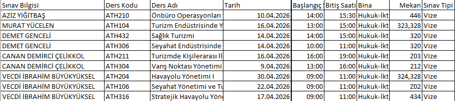 2026 Turizm İşletmeciliği Bölümü Vize Takvimi ve Yerleri