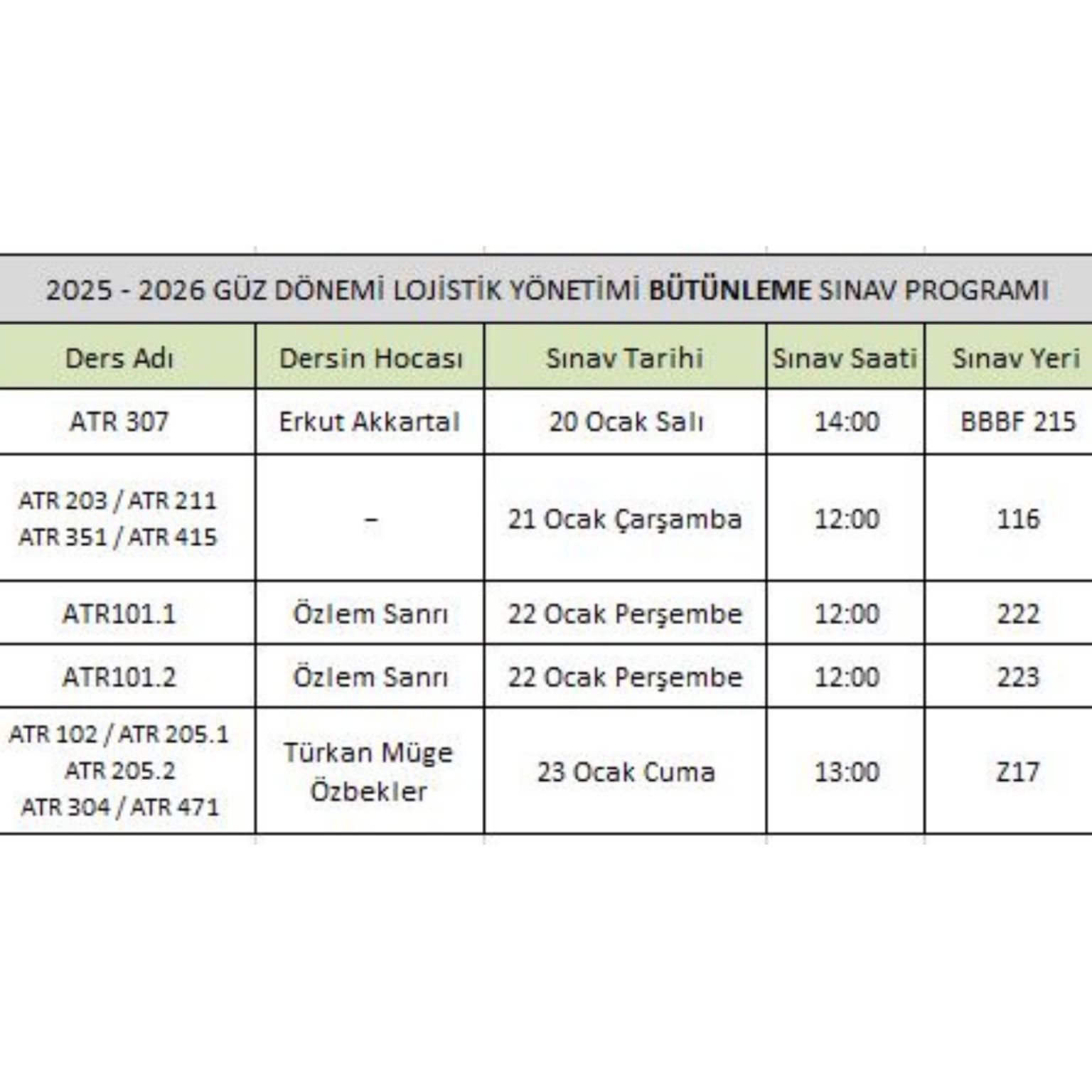 Lojistik Yönetimi Bölümü 2025 Güz Dönemi Bütünleme Sınav Takvimi